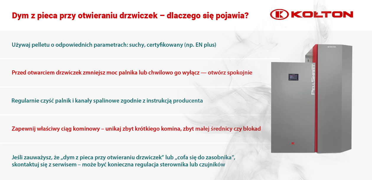 Jeśli piec nie ma stabilnego ciągu, przy otwarciu drzwiczek może dojść do cofania się spalin. W takim przypadku zachodzi pytanie: „dlaczego dym cofa się do zasobnika?”. Rozwiązanie: sprawdź przewód kominowy – jego wysokość, przekrój, czy nie jest zapchany. Firma Kołton w swoich instrukcjach montażu przewiduje właściwe warunki komina, co ułatwia użytkowanie. - Zbyt szybkie otwarcie drzwiczek lub duża różnica ciśnień